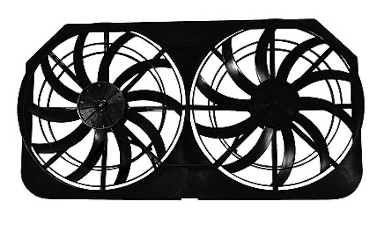 Featuring the manufacturer’s quiet S-blade design, the Mach Two Extreme Dual 16-inch Fan works as a powerful puller fan to deliver a maximum airflow of 4320 cubic feet per minute (CFM) with an amp draw of 35.4. The fan, which has two 225 watt sealed heavy duty motors that are IP68-certified dustproof and waterproof, is designed to provide increased horsepower, more cooling and better fuel efficiency. It measures 17″ high by 33.5″ wide by 3.9″ deep.