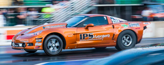 Carlyle set numerous records, including the LSX Drag Radial record in quarter-mile competition back at the 12th Annual NMCA World Street Finals in October 2013 with an astounding 6.69 at 217 miles per hour. Later that year, he went 6.58 at 220 miles per hour during the Haltech World Cup Finals Import vs. Domestic event, on his way to winning the title in Radial vs. Modified competition. Since then, the Corvette has seen the 4.30 elapsed time range in the 1/8-mile and many more thunderous runs with IPS Motorsports colors flying proud.