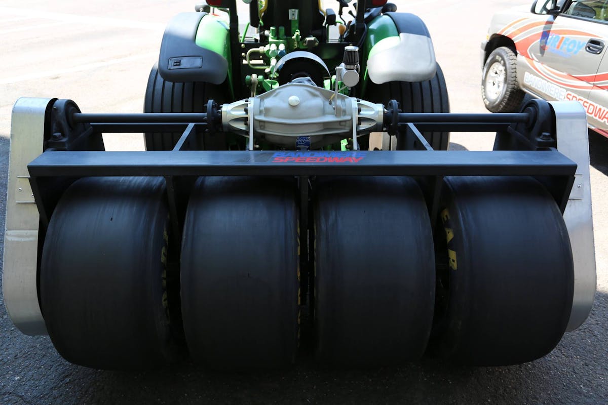 But track prep guru Larry Crispe, who calls the Bandimere Speedway near Denver, Colorado home, felt that an actual set of drag racing slicks would be better served as the provider of the rubber on such pieces of equipment, and concocted an implement that features four Goodyear rear slicks that are turned in the direction opposite of the forward motion of the tractor that’s pulling it, which creates a high degree of friction and therefore rubber contact with the surface.