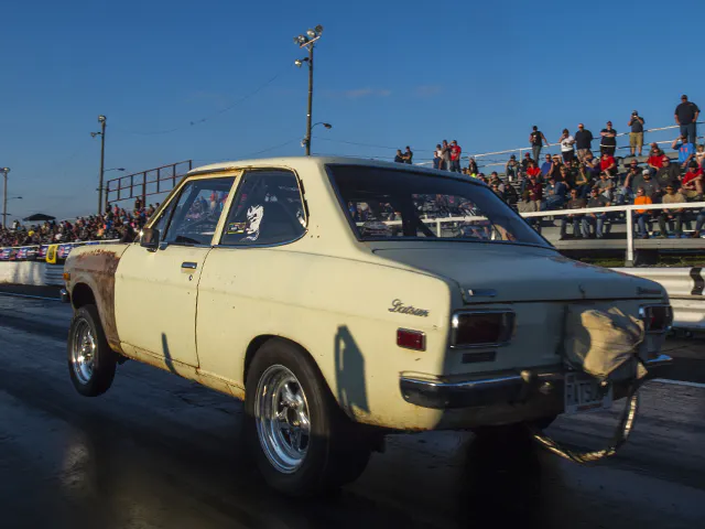 Smith’s Datsun is surprisingly stock, riding on stock suspension all around and a host of junkyard components to maintain the fun-on-a-budget aspect. The engine is a GM 3800 yanked from a 2005 Pontiac Grand Prix and fitted with a turbo sourced from a 6.5 liter Chevy diesel pickup. The lightweight import features a PTC-built TH350 transmission with a custom PTC 10-inch converter. Behind that, a Chrysler 8-3/4 inch rear end houses 3.91 gears and beefy 35-spline axles, which spin Weld wheels and Mickey Thompson 235 drag radials handle the traction. The car is very much streetable, maintaining working wipers and a radio for cruising comfort.