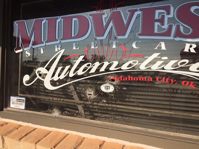 According to the Midwest Street Cars Facebook page, the business, which is owned and operated by Justin “Big Chief” Shearer and Shawn “Murder Nova” Ellington, was fired upon with semi-automatic weapons, doing damage to windows, doors, and interior walls. After the vandals left the shop, they were reportedly seen on surveillance cameras approaching the home of Ellington, but were spooked when Ellington stepped outside and left the area without firing any of their weapons.