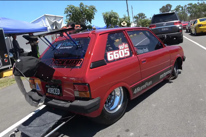 Adrian’s Alto has been heavily modified so it would work at the dragstrip. The Suzuki features a full tubular chassis that keeps Adrian safe and helps the car run deep into the 8-second zone. The Alto is now powered by a 2.6-liter Mitsubishi 4G54 engine that uses mechanical injection, feeds on methanol for fuel, and is backed by a Powerglide transmission. Adrian has run a personal best of 8.77 in the Alto…that’s flying for such a small displacement engine.