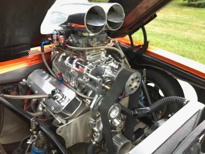 The car delivers that power through a Reid Powerglide transmission to a Mark Williams 9-inch rear with 4.90 gears and a spool with 40-spline axles. A 4-link rear suspension setup and a strut front suspension help handle the power put to the ground through a set of 32x14x15 Hoosier Quicktime Pros wrapped around Weld Racing RT wheels.