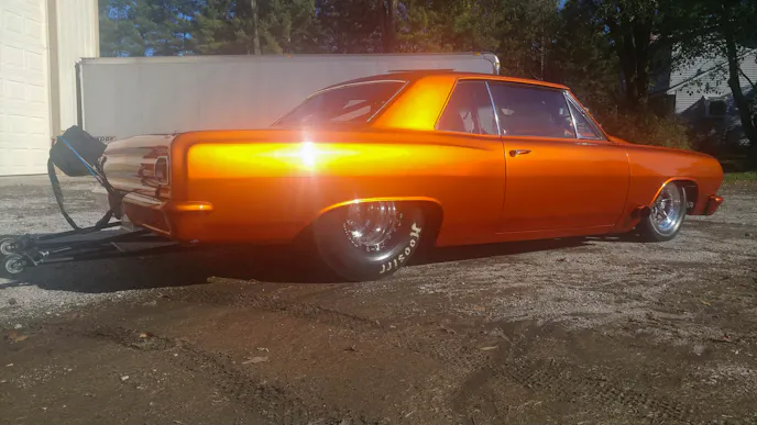 The car delivers that power through a Reid Powerglide transmission to a Mark Williams 9-inch rear with 4.90 gears and a spool with 40-spline axles. A 4-link rear suspension setup and a strut front suspension help handle the power put to the ground through a set of 32x14x15 Hoosier Quicktime Pros wrapped around Weld Racing RT wheels.
