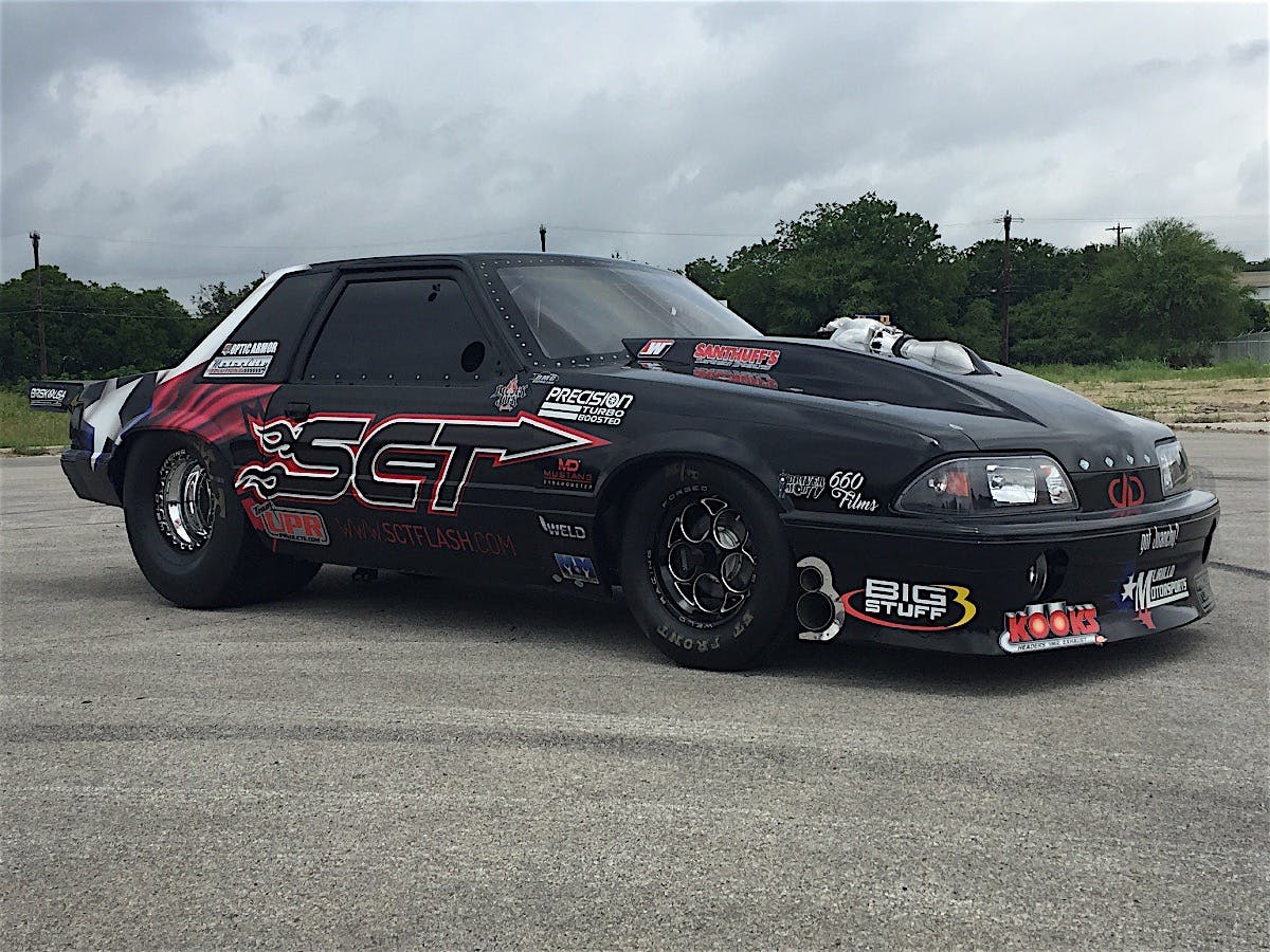 The newest revision to LaFawnduh (Murillo’s iconic Fox body Mustang) includes a new placement the turbo inlets. Murillo’s team moved the massive Precision Pro Mod turbos from the center of the bumper to the lower outsides of each of the front bumper, mirroring the iconic look of a Fox body Mustang GT’s foglights.