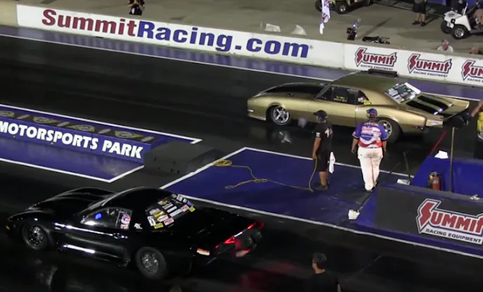 Both cars feature twin turbo ProLine Racing engines, though they take noticeably different approaches to going fast. Mills’ Golden Gorilla relies on PLR’s venerable 481X-headed Outlaw 572, which is listed as producing 4,000+ horsepower on ProLine’s website, though it seems very likely the actual number may be well north of there. Berry’s sleek black C5 Corvette relies on one of the baddest small-block powerplants on the planet, a 454-inch mill, built especially for Berry by PLR, that features MAST’s wicked Mozez heads. This combination is rated at 3,300 horsepower, but also allows Berry to run at a lighter minimum weight, thus leveling the playing field for the small-block screamer.