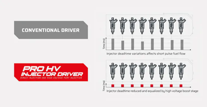 Now, the PRO HV Injector Driver will also work with engines that use port injection setups with large and low-impedance injectors. It can make a big difference in reducing injector dead time. This reduction will create better fuel atomization at low load levels, smooth out the engine’s idle, improve transient fueling, and help create a more linear fuel map. This means you can run a large injector on a street car without having drivability issues.