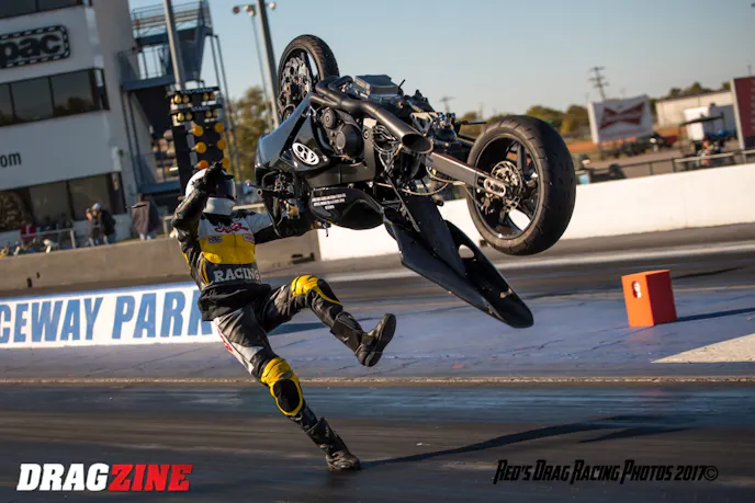 Stevens launched off the starting line and the front of the bike started coming up immediately. He tried to keep the bike under control but there was nothing he could do as the nitrous-fed Honda threw him backwards off of the bike and flipped over. Ace photographer Patrick “Red” Williams was in the right place at the right time and captured the entire sequence of the incident and shared them with Dragzine.