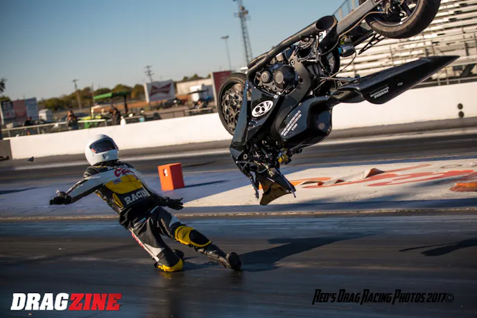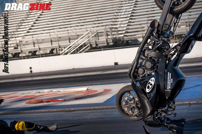 Stevens launched off the starting line and the front of the bike started coming up immediately. He tried to keep the bike under control but there was nothing he could do as the nitrous-fed Honda threw him backwards off of the bike and flipped over. Ace photographer Patrick “Red” Williams was in the right place at the right time and captured the entire sequence of the incident and shared them with Dragzine.