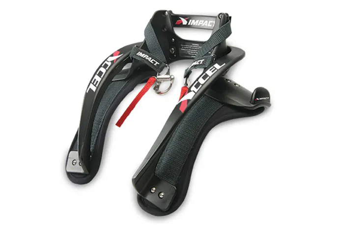 Impact’s Accel is made from a DuPont carbon fiber composite material and weighs a mere 1.8 pounds, resulting in less driver fatigue on race day. The design and choice of materials in the Accel FHR allows the device to flex in unison with the body during the course of competition thus minimizing driver fatigue and pressure points.