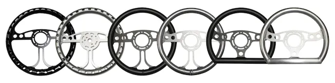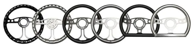 Made of lightweight aluminum alloy, these unique designs are available in 12” and 13” O.D. The wheel has provisions for Qty-4 buttons; 2 on each side and has the option of 3 or standard 5 hole bolt pattern. You also have the option of getting the wheel in semi gloss black or raw finish.