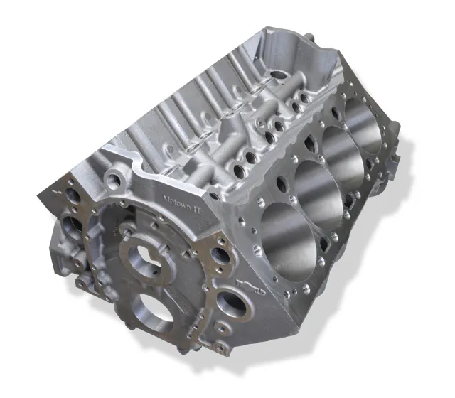 Equipped with SBC or LS motor mounts, the new Motown II engine block can be configured at the foundry as either an SBC or an LS type. The SBC version uses the conventional deck height of 9.025 inches and accepts any 17-bolt small-block Chevy head; the LS version uses the conventional 9.240 deck height and accepts all LS cylinder heads.