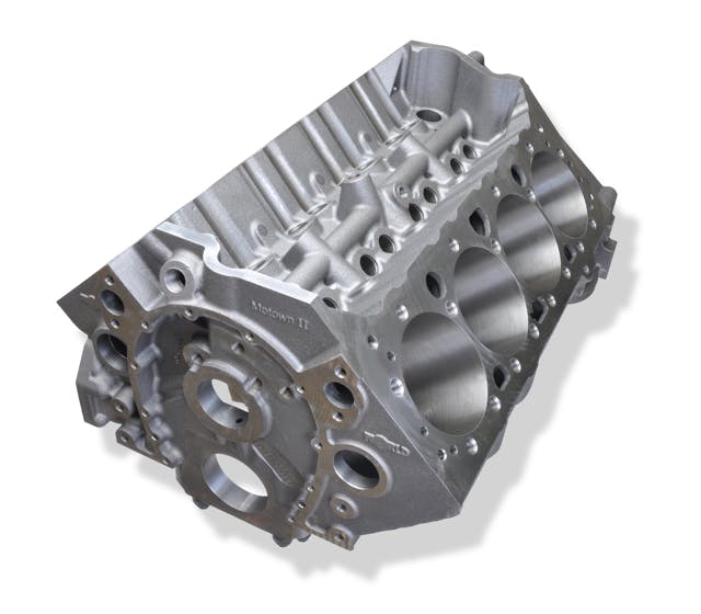 Using standard SBC crank, cam bearings, and ignition, the Motown II weighs approximately 190 pounds—75 pounds less than GM’s LSX iron block. It is available in Street, Sportsman, or Race series (SBC), bare or fully race-prepped. The Street and Race blocks are supplied with bore sizes of 3.990 or 4.115 inches and the Prepped blocks to 4.000 or 4.125 inches. The Motown II can be bored safely to 4.200 inches.