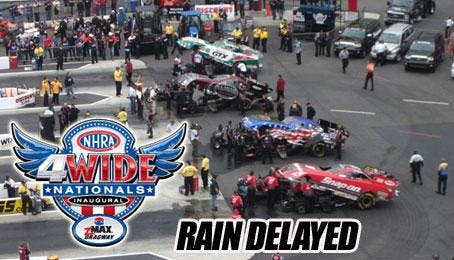 Persistent afternoon rain at zMax Dragway has forced NHRA officials to postpone the conclusion of the inaugural NHRA Four-Wide Nationals until Monday. The Top Fuel and Funny Car finals are set while Pro Stock and Pro Stock Motorcycle still have two rounds to go.