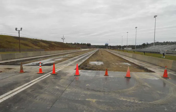 show” national event to the far Northeast in the coming years. A brand new concrete racing surface was poured from start to finish last winter, along with the installation of Musco lighting and the construction of a sand trap built to the spec of other tracks on the Full Throttle schedule. A list of other improvements are likely to come over the next several months to bring the facility up to the NHRA’s code for pit space, parking space, seating, safety, and overall aesthetics.