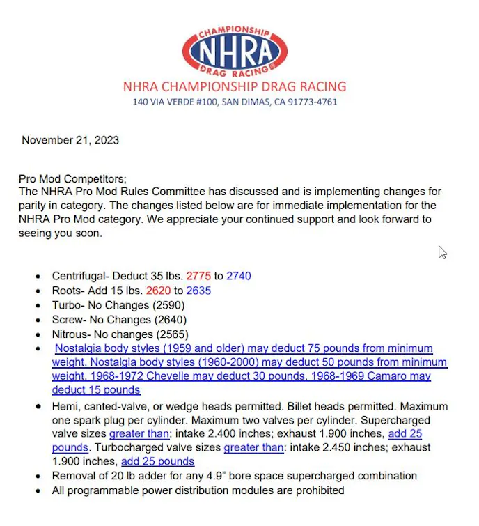 Other adjustments relate to parity, and have likewise raised some eyebrows. The centrifugal supercharger combination is permitted to reduce 35 pounds from its 2,775 pound minimum in 2023, and the roots supercharger combination must add 15, up to 2,635. The nitrous combo holds steady at a hefty 2,565 pounds, and the once-heralded turbocharger combination, which has been ripe for the picking for years with no takers, holds at 2,590 pounds.