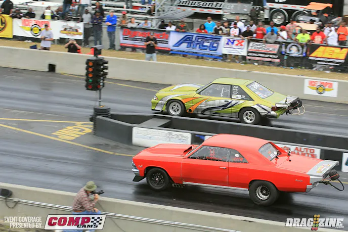 Effler also points out that most public roadways have a crown, a peak in the center to help rainwater runoff quicker. This can lead to control issues for any car, but is exacerbated by the speeds these cars reach, likely nearing 140 mph, as they approach the finish line, and the wide-and-skinny tires the cars race on, which do not behave like the radials on your mom’s Park Avenue.