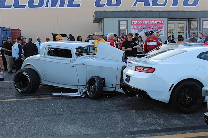The incident began as the driver of the ’32 Ford was weaving his way through the staging lanes. The drivers’ suicide door inadvertently opened and managed to clip the open door of a Fox body Mustang. As the driver turned to look back, it appeared that he may have mistakenly hit the throttle pedal instead of the brake, pitching the roadster sideways and sending it straight toward the Callaway Camaro and another Mustang.
