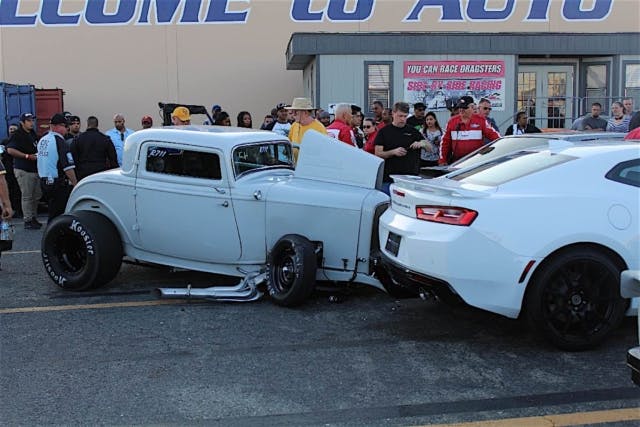 The incident began as the driver of the ’32 Ford was weaving his way through the staging lanes. The drivers’ suicide door inadvertently opened and managed to clip the open door of a Fox body Mustang. As the driver turned to look back, it appeared that he may have mistakenly hit the throttle pedal instead of the brake, pitching the roadster sideways and sending it straight toward the Callaway Camaro and another Mustang.