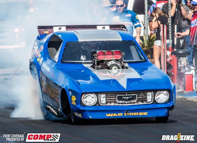 Following his retirement from the construction industry in 2010 and with nostalgia racing soaring in popularity, Garten brought the War Horse back to drag racing. He attended Frank Hawley’s Drag Racing School and earned his NHRA license. Then he, along with Tocco, assembled the new War Horse — featuring a Plueger chassis and a Brad Anderson powerplant with Alan Johnson cylinder heads and a ’73 Mustang body, to go racing with the NHRA Hot Rod Heritage and IHRA Nitro Jam Series, along with match races and other events. Garten qualified at every event he attended that first season and even won the Sacramento Nitro Night of Fire — an event he’d won in the original War Horse 35 years earlier.