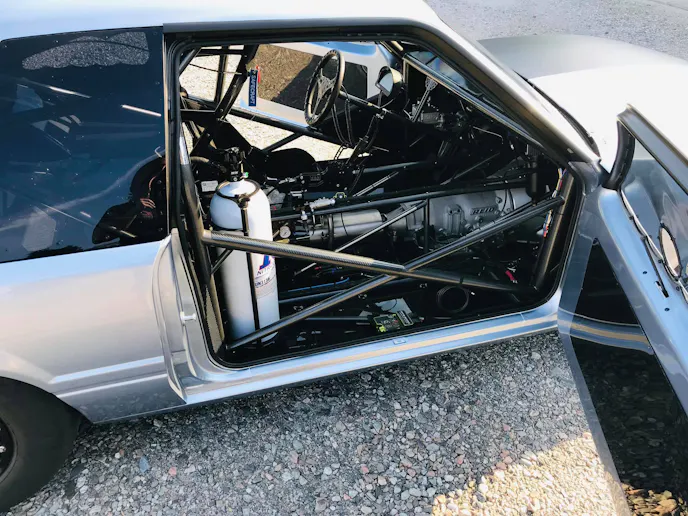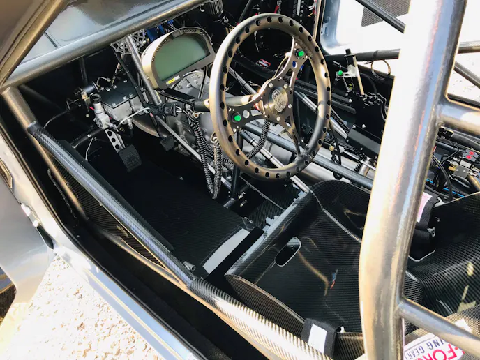 The car retains the stock-style front and rear suspension pickup points. The interior is fully carbon-fiber, and Joe notes that every bar in the chassis not required to be chromoly per SFI specs is made from titanium.