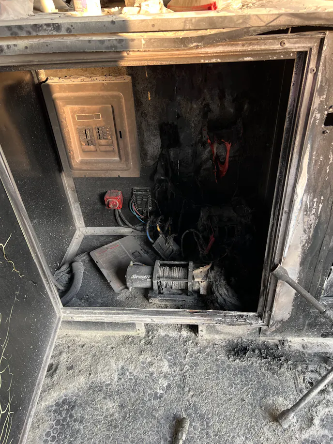 “It needs a counter top, a new winch, and new wiring to the winch. It went out so fast there isn’t even smoke damage in the trailer. You talk fire system and a lot of people know about the little balls you hang in there, but I didn’t realize what this fire system was capable of until the other night. I had no idea. There isn’t $500 worth of damage in the trailer.”