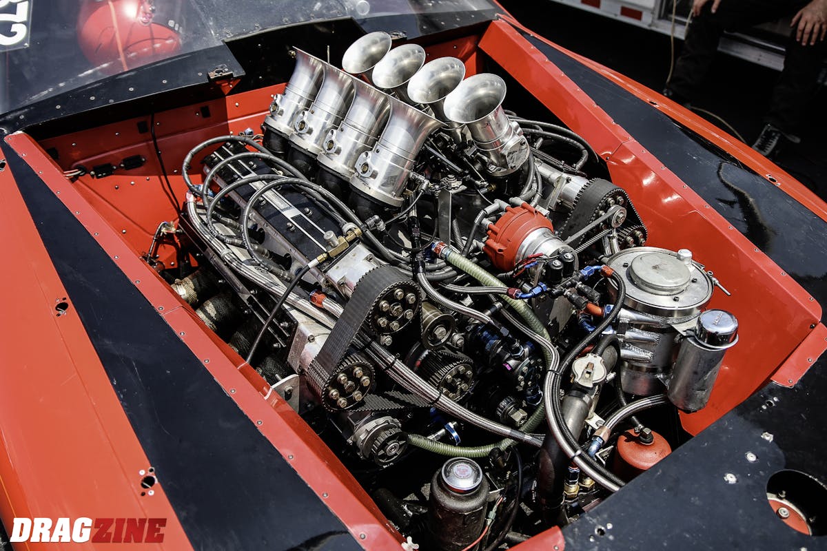 The Batten B4 that powers Donovan’s Top Sportsman Firebird is a wild piece of engineering. This big-block uses a total of four overhead cams and four valves per cylinder. Fueling the engine is a mechanical fuel injection system that Donovan has put a lot of time into developing. It does an excellent job of keeping the engine fed, happy, and running consistent times at the track.
