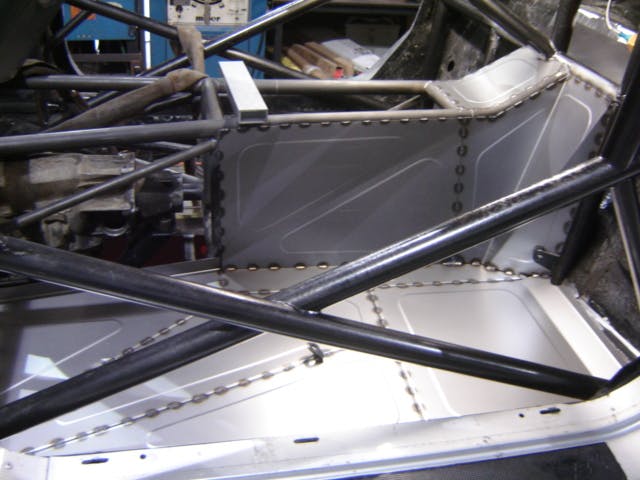 As 2010 graced its presence the rebuild was already burning the midnight oil at the Halifax, Massachusetts based DMC. Dennis and his crew started cutting away the torn and tattered body panels and well as the extensively damaged front end of the chassis. From the looks of the progress it has been taken on as it were a brand new build due to the extensive damage. One of the unique features is that Dennis has incorporated a removable transmission tunnel for ease of access during transmission swaps.  That is one of the gremlins that Paul has endured over the past few seasons due to the extreme heat from the turbo piping running through the car towards the back of the rear mount setup.