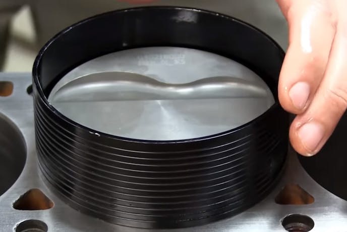 The first thing you’ll need is some type of tool to compress the piston rings so you can slide the piston and connecting rod into the engine block. There are several adjustable tools available for this task, but they each have their own drawbacks and those are explained in the video. The best tool for the job is a ring compressor that’s specific for your bore size. Before you slide the piston and rod into the engine block, you’ll want to coat the inside of the cylinder with plenty of oil to prevent damage to the bore.
