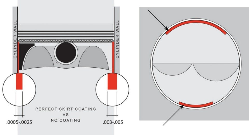 The Perfect Skirt coating is designed to help 2618 alloy pistons that are commonly used in high-performance applications address their larger piston-to-wall clearances that can cause excess engine noise during cold startup. This type of noise can sometimes be mistaken for a much bigger issue like a rod trying to exit the engine.