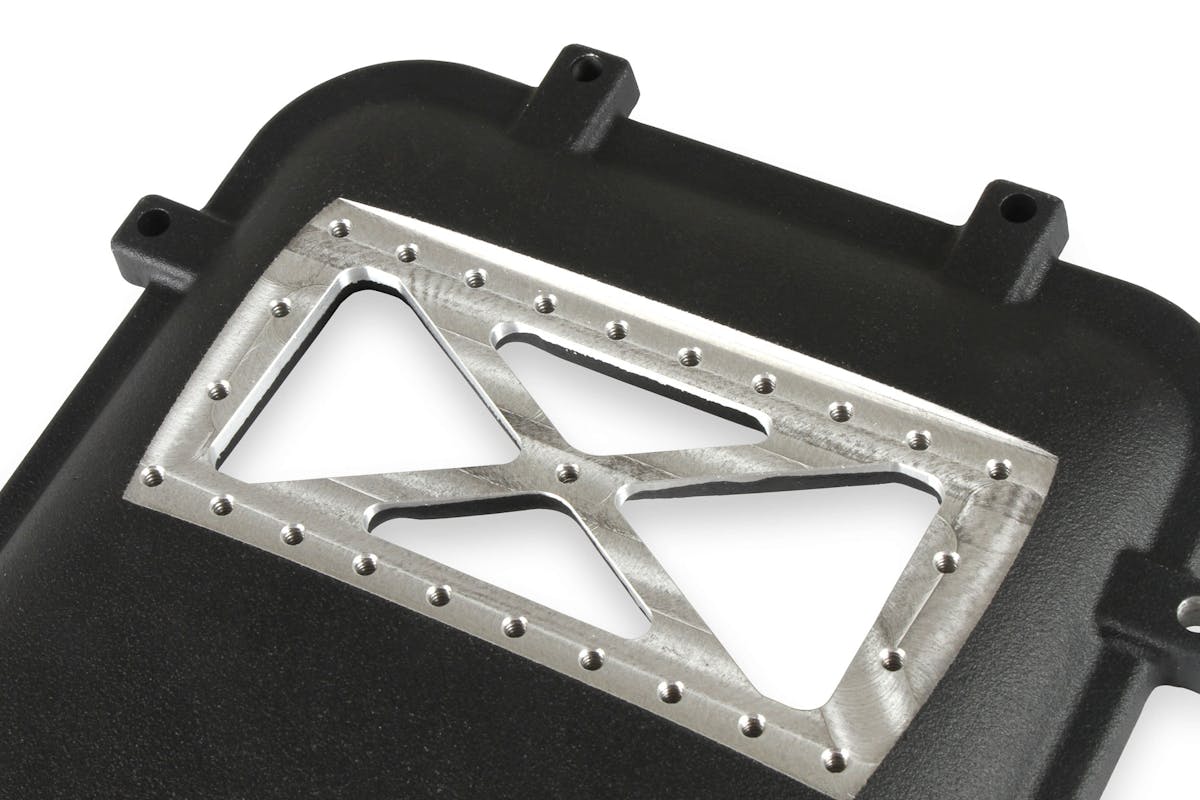 The Lo-Ram intake plenum top that’s equipped with burst panel provisions uses a standard SFI-approved 6-1/8” x 3-1/8” sized panel that’s available from Holley and many other manufacturers. The burst panel is designed to be the failure point when too much boost is introduced into the intake, rather than the intake failing itself. You can even purchase a burst panel duct to go with your Lo-Ram intake to direct the force of a burst panel releasing away from your engine.