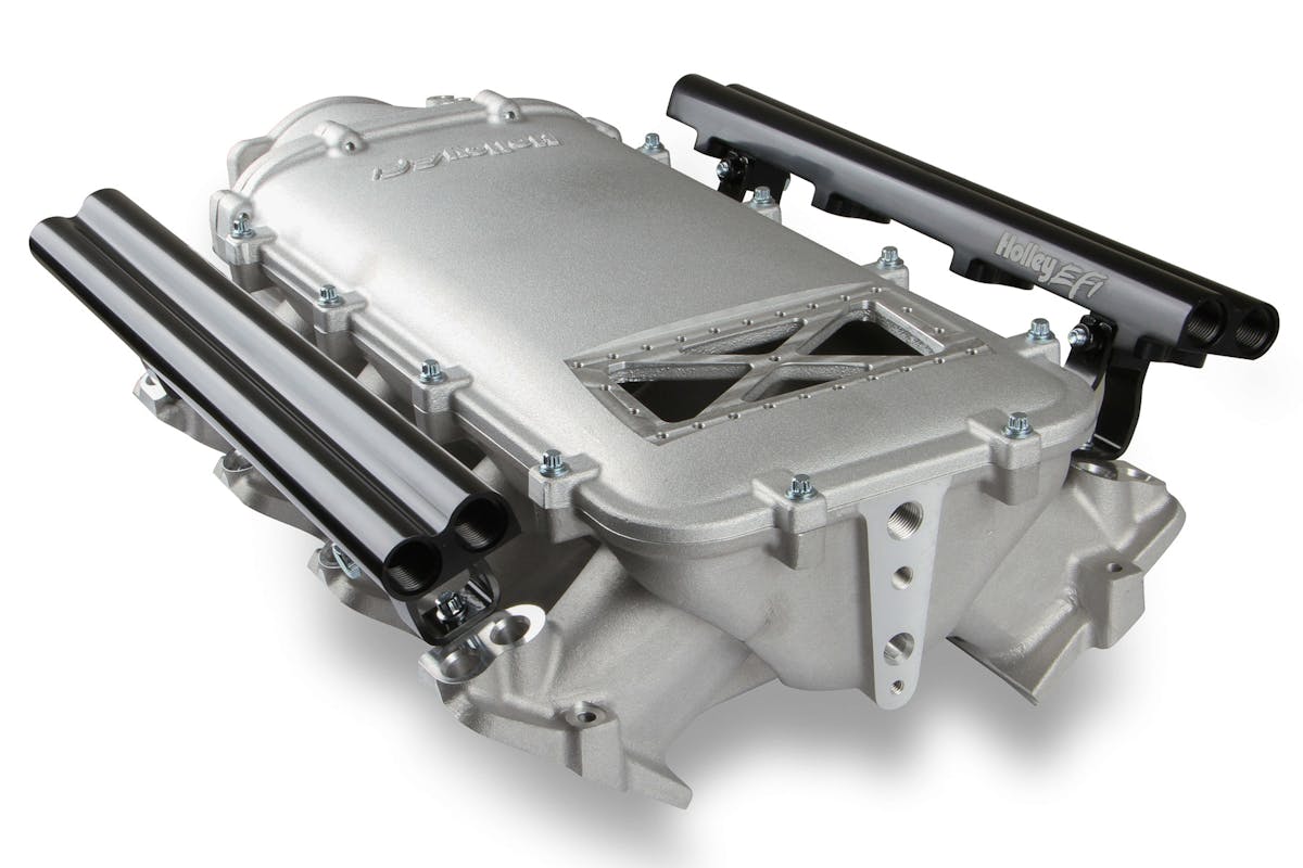 Holley developed its Lo-Ram intake line to work with forced induction applications that are making power the most power in the 7,000-8,000 RPM range. These intakes use a modular design that allows a user to install different intake plenum tops based on their needs. The Lo-Ram intakes are perfect for cars that have limited space under the hood. The intakes are available with provisions for dual injectors and can be purchased with high-volume fuel rails.