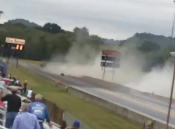 Wantye, who was involved in an incident in what’s believed to be the same car at the PDRA Memphis Drags last year, was making a single pass in the repaired Camaro when, for unknown reasons, it shot across the race track past the half-track marker and struck the concrete retaining wall. Although details are scarce, the impact reportedly broke the engine and front half of the car away from the chassis, sending parts scattering over the wall. Other debris can be seen striking the finish line scoreboards in the video, as well.