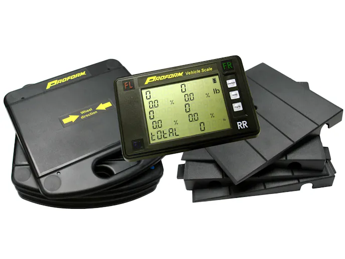 The newest PROFORM high-value automotive tool is a Wireless Scale Kit (Part No. 67647). This system consists of four wheel pads, four ramps and a wireless monitor, all of which fit in a durable nylon carrying case. Twenty AA batteries are even included.