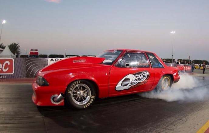Q80’s Abdullah Al Shatti bettered the series’ Super Street class record that was previously set by popular American driver ‘Stevie Fast’ Jackson in testing this week, driving the team’s Fox body Mustang to a 4.294 at a booming 188.99 MPH in the eighth-mile on a set of 29 x 10.5-inch slicks, bettering the previous mark by a mere .001-seconds.