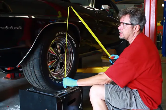 Narrated by QA1’s Dave Goldie, the fist video illustrates how to measure the on-the-car ride height of a vehicle, which is a fairly quick and straightforward process. To do so, you simply measure from the ground to the center of the wheel opening, straight though the centerline of row wheel itself. Goldie suggests ensuring that your suspension is fully relaxed (in other words, don’t drop it from a lift and measure the ride height without rolling around to take out the tension) in order to get a true and accurate ride height measurement.