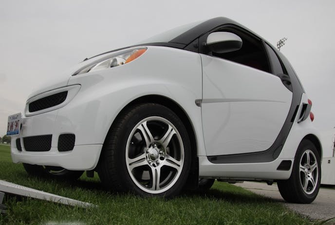 Barnes, a machine shop owner, has outfitted his Smart FourTwo with a 1.5L Toyota Tercel 5EFE engine and transmission setup, with a Sprintex supercharger pushing 28 pounds of boost into the 500 cfm carburetor through an intercooler. Barness accomplished this feat in the incredibly small real estate that the Smart Car affords by removing the stock engine and building a box over the rear of the car to fit the physically larger engine.