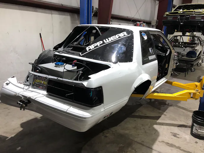 Tin Soldiers Race Cars opened their shop up to Martin, Doug Wagner, Kevin Conley and his son to work on the car. They began tearing the car apart Saturday and got the entire driveline out, along with the entire rearend. Jason and Brad from Tin Soldier allowed them to do what needed to be done and instructed them to just lock up when they were finished. After an all-night thrash session the guys had the Mustang stripped and ready for inspection on Monday; their hope was that Section 8 could be brought back to life.