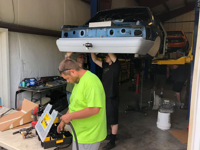 Martin didn’t want to load the damaged Mustang into the team’s stacker trailer due to the damage it might cause, so another friend stepped up to offer an open trailer to take it home to Wisconsin, but Jason from Tin Soldiers had another idea.