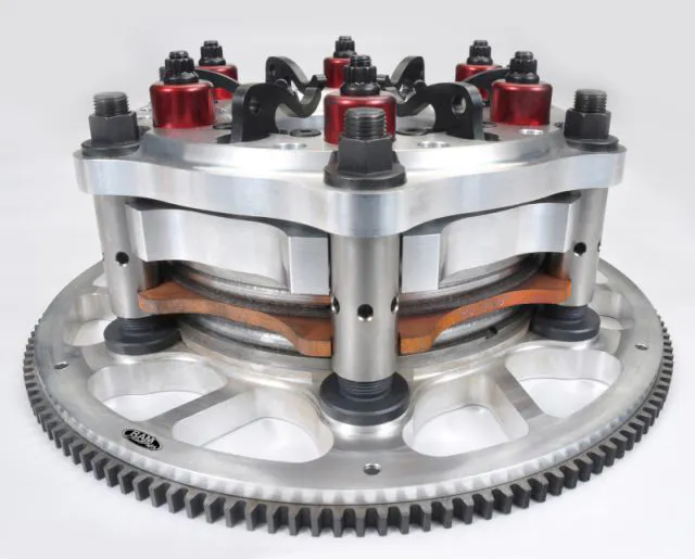 From heat treated 4140 high tensile alloy steel, Ram constructs the splined hub and fastens it to the core plate with eight 1/4in stainless steel rivets. The hub usually features 10 splines to accommodate Liberty or G-Force transmissions.
