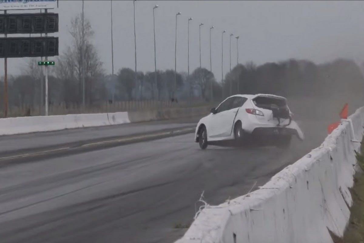 Getting from A to B in a short wheelbase racecar that makes big power is a lot like wrestling with an alligator; it’s risky, takes a lot of concentration, and things can go wrong in the blink of an eye. Randy Westmoreland was trying to wrestle his very unique Mazda Speed 3 known as “Snow White” down the track at the Small Tire Legends event when the car decided it wanted to bite him like a giant reptile and take him on a scary ride.