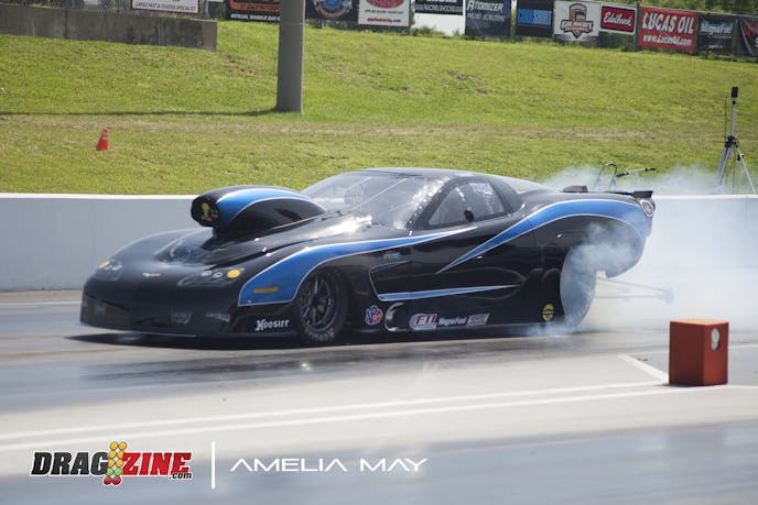 Chris Varni lined up with Clint Downs during Small Tire class action with their run having an interesting conclusion. Varni was paying attention to the win lights over the fast-approaching end of the track and things almost got ugly.