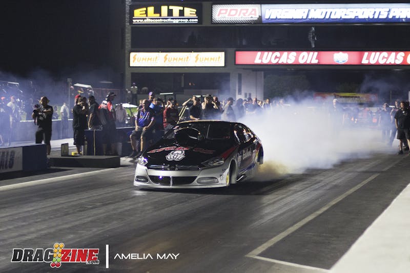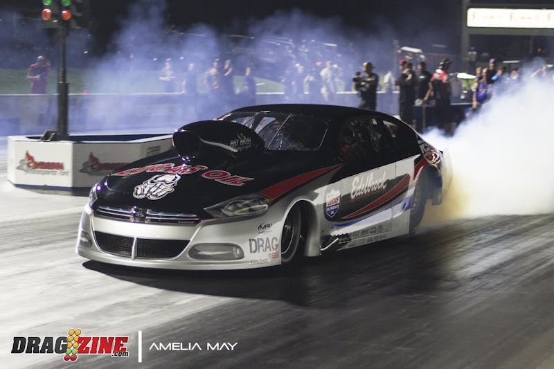 Chris Varni lined up with Clint Downs during Small Tire class action with their run having an interesting conclusion. Varni was paying attention to the win lights over the fast-approaching end of the track and things almost got ugly.