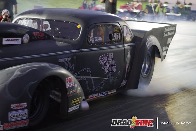 Chris Varni lined up with Clint Downs during Small Tire class action with their run having an interesting conclusion. Varni was paying attention to the win lights over the fast-approaching end of the track and things almost got ugly.