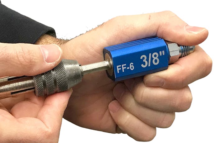 Raczuk machined a tool that could be used on a drill with a 45-degree face, a guide, and then he case-hardened the tool. This tool would perform the lapping operation and would be coated in valve grinding compound to refinish the fitting’s surface. The Fitting Fixer you can purchase uses a diamond dust coating that’s found on most cutting tools to make the process more effective.