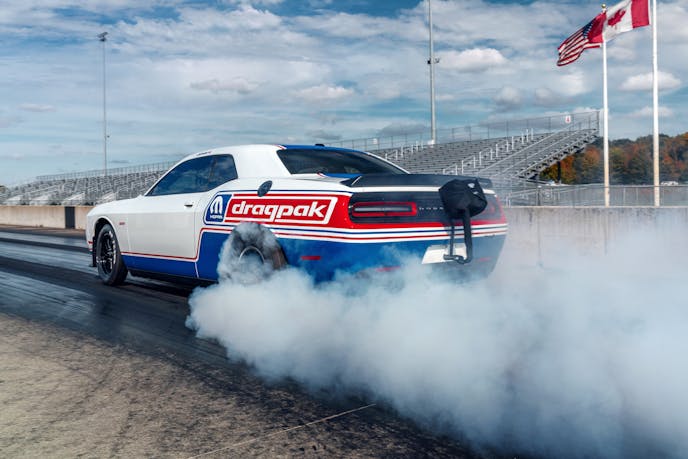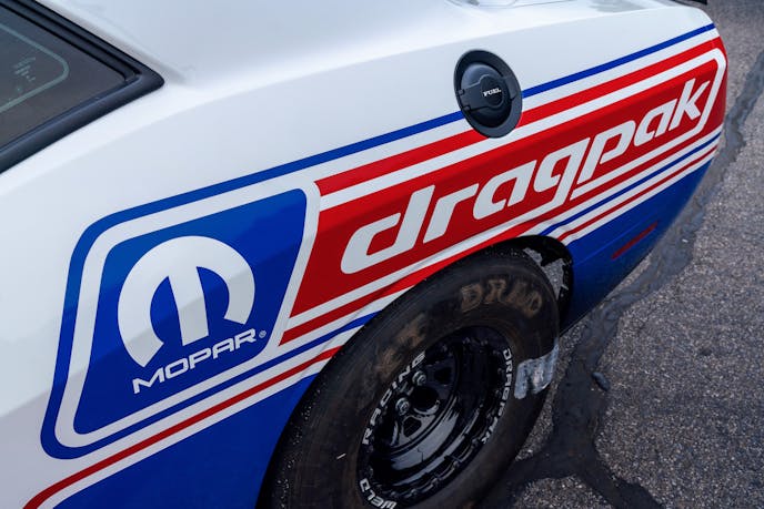 The new Drag Pak comes standard in White Knuckle and is available in five optional high-impact exterior colors: Hellraisin, Pitch Black, Smoke Show, TorRed and Frostbite. Full-color or monochromatic graphics packages are anchored by the Mopar logo and additional “drag pak” or “direct connection” billboard graphics on the quarter panels above the rear wheels. The graphic band wraps around the rear of the car, visually connecting both sides of the vehicle.