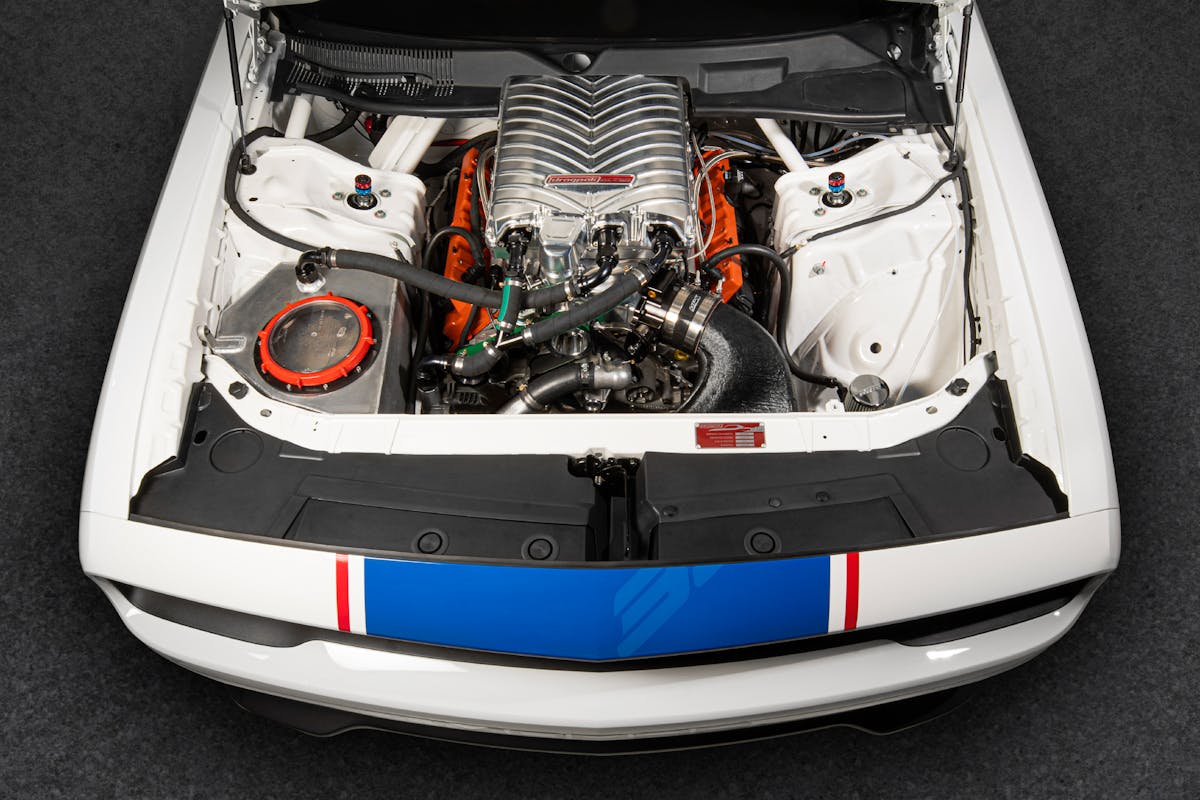 Numerous enhancements include an all-new 3.0-liter Whipple twin-screw supercharger, upgraded forged internals, new front accessory drive and a new fabricated aluminum ice tank with a clear lid that cools the supercharger intercooler. The engine combination has been fully validated by Mopar engineers on the dyno, as well as the drag strip, and is approved for the NHRA FSS and NMCA classes.