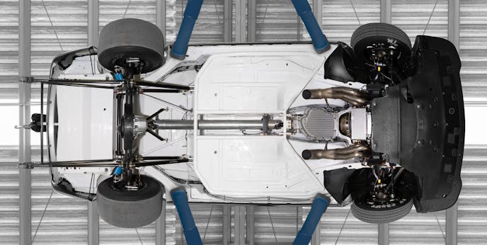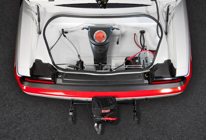 Out back, a trunk-mounted, SFI-certified three-gallon drag race fuel cell feeds a brushless racing fuel pump with dual inline filters. Axle-mounted wheelie bars are standard, as is a 10-foot parachute mounted rigidly to the frame rails via a unique tubular mount.