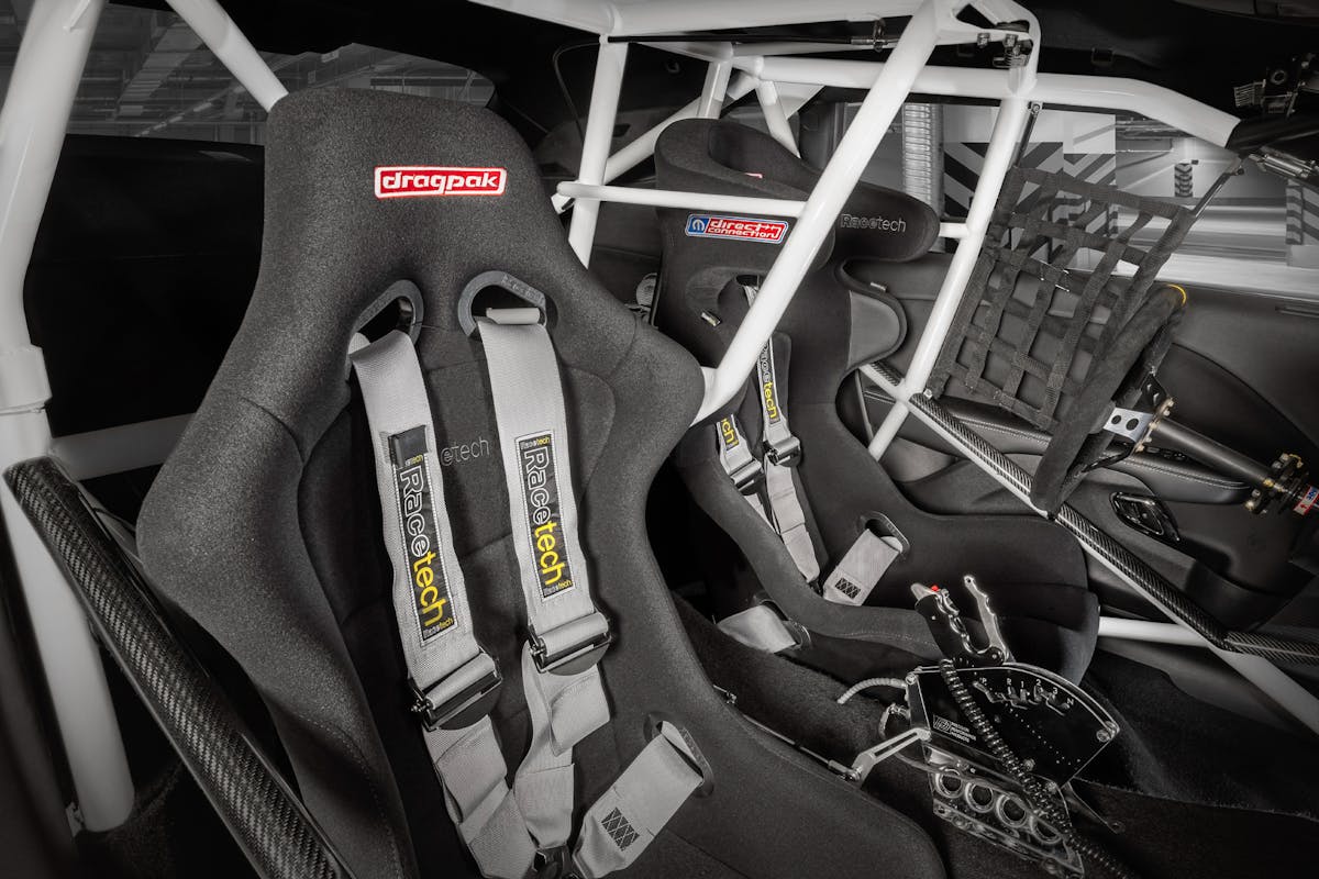 A choice of lightweight Racetech composite seats and Racetech HANS-ready cam-lock harnesses are FIA- and SFI-compliant. Both driver and passenger seats feature the Drag Pak logo embroidered on the seat back, while the optional Head Restraint Seat Package features a winged driver seat.