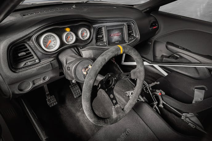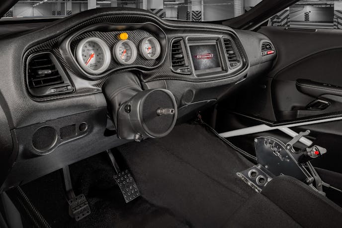 On the passenger side, a custom red and chrome Drag Pak serialized badge signifies the one-of-50 build sequence numbers. Driver comfort is achieved with the adjustable mounts that are included for the seats and racing pedals. Driver control is delivered through a mechanical floor shifter and lightweight steering column with quick-release steering wheel.